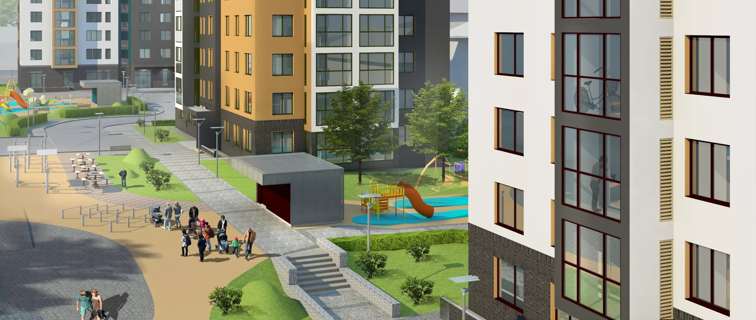 В домах предусмотрен подземный паркинг и гостевая парковка у дома. Подъезды – по 1 в доме, с просторными, светлыми лестничными маршами, проходами и холлом. Есть место для хранения колясок, велосипедов и инвентаря. Подъем на этажи осуществляется надежным, быстроходным лифтом OTIS, без длительного ожидания.