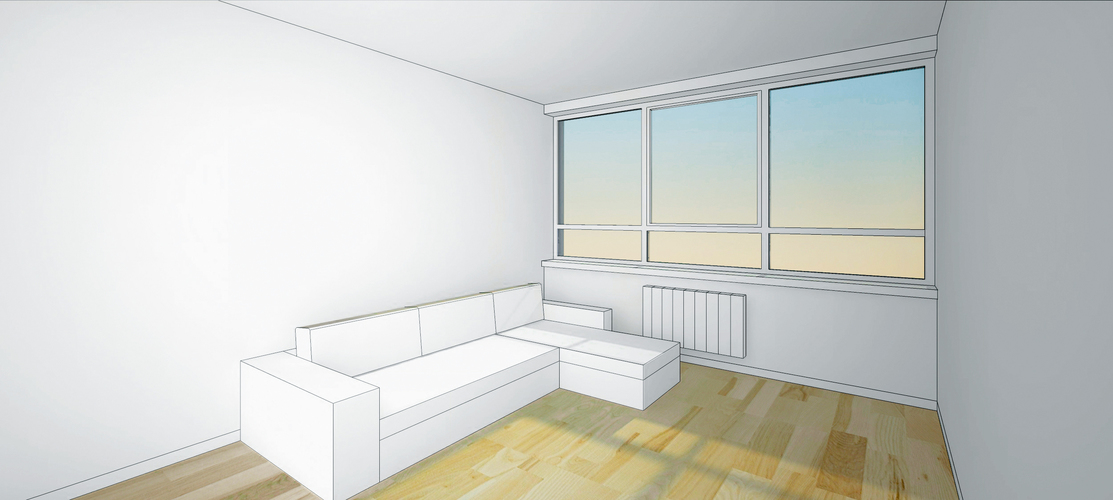 - Трехстворчатыми окнами на ширину стены без подоконника.