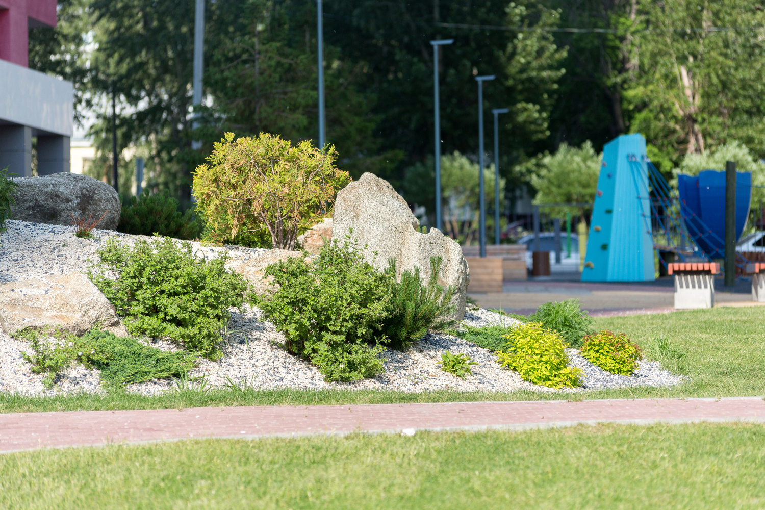 По периметру двора посажены молодые деревья — яблони, ели. На детской площадке песочница, игровые комплексы для малышей и дошкольников, горки, грунтовые батуты, качели-балансиры, навесные и с гнездом. Придомовая территория хорошо освещена — установлены фонари наружного освещения, смонтирована подсветка пешеходных зон.