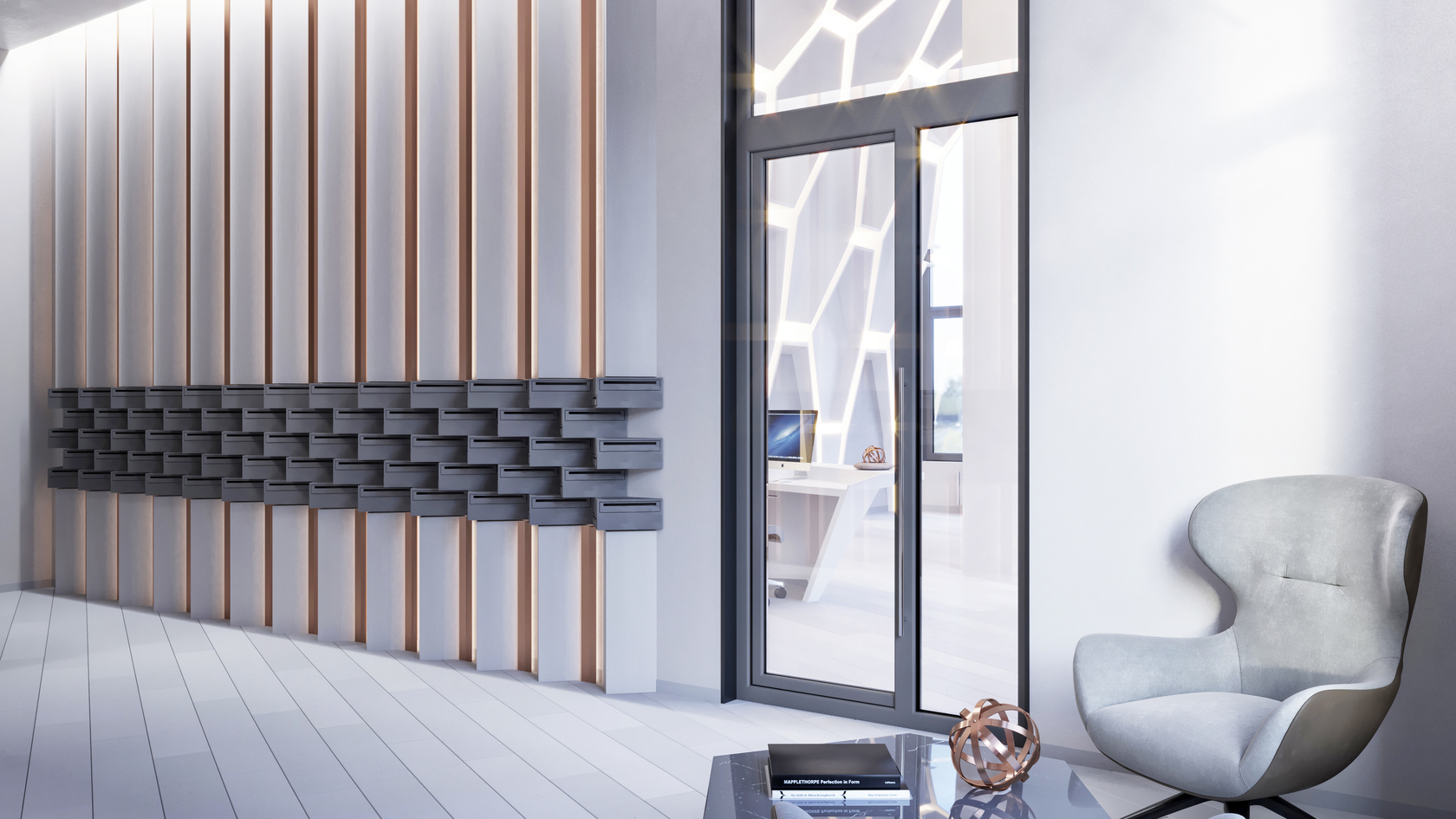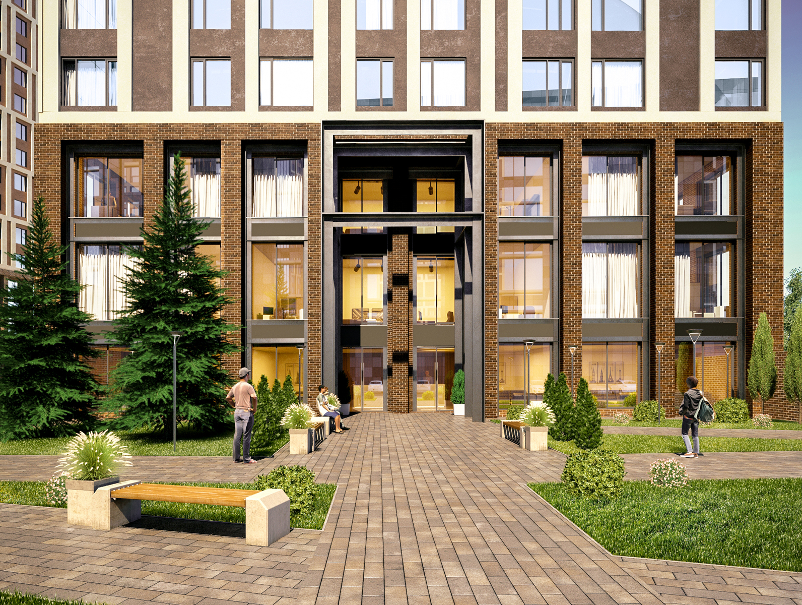 Войти в подъезд можно будет с той стороны, где проходит прогулочная аллея, вход — без ступенек, на уровне тротуарного покрытия. В главном холле спроектирована стойка администратора, просторная колясочная, удобная зона ожидания для гостей. Для почтовых ящиков предусмотрено отдельное помещение рядом с вестибюлем. Будут работать пассажирский и грузовой лифты. Дизайн главного холла выполнен в урбанистическом стиле — панорамные окна, яркая подсветка, криволинейные формы, оригинальный декор.