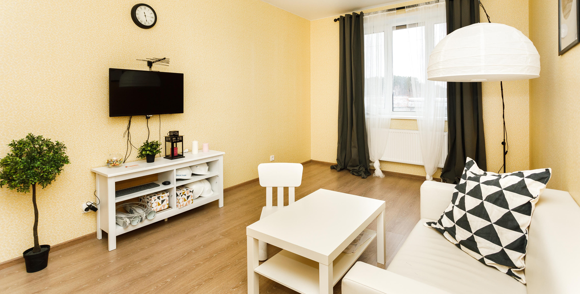 - На полу бетонная стяжка с усиленной шумоизоляцией, ламинат в жилых комнатах 32 класса (DPL), на кухне — износостойкий 33 класса (HPL).