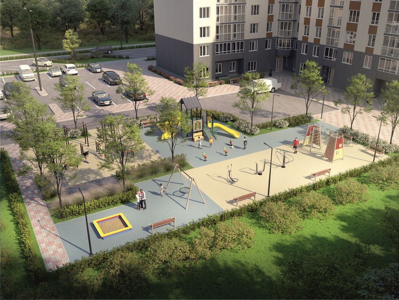 Придомовая территория разграничена на зоны — детские и спортивные площадки, места для прогулок и отдыха, велодорожки. На площадке каждый найдет себе занятие по душе. Для самых маленьких обустроена большая песочница, рядом с ней скамейка, где можно отдохнуть. Для детей дошкольного возраста — качели, лазалки, горки. Подростки могут развивать свою силу и ловкость на турниках, тренажерах, шведской стенке
